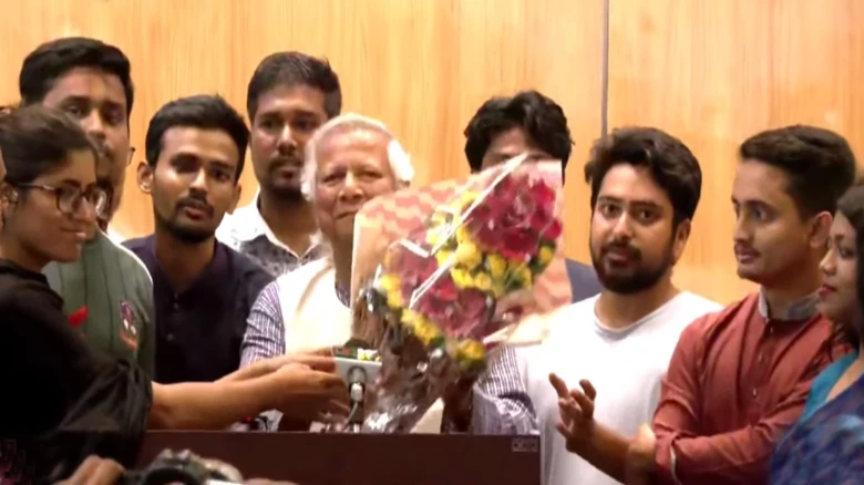 ড. ইউনূসকে ফুল দিয়ে বরণ করলেন সমন্বয়করা...